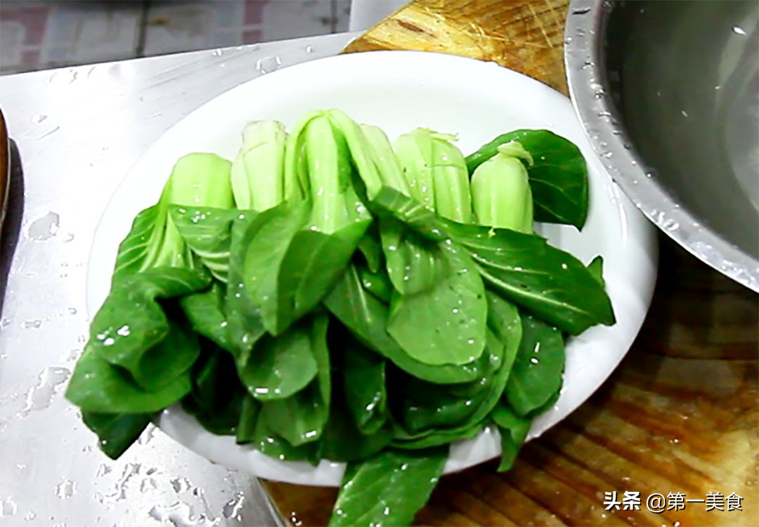 锅里加入清水,加入适量的食盐和植物油,这样焯出来的青菜菜色更鲜亮,水烧开后倒入上海青,焯水30秒钟捞出控干水分,摆放在盘子里。