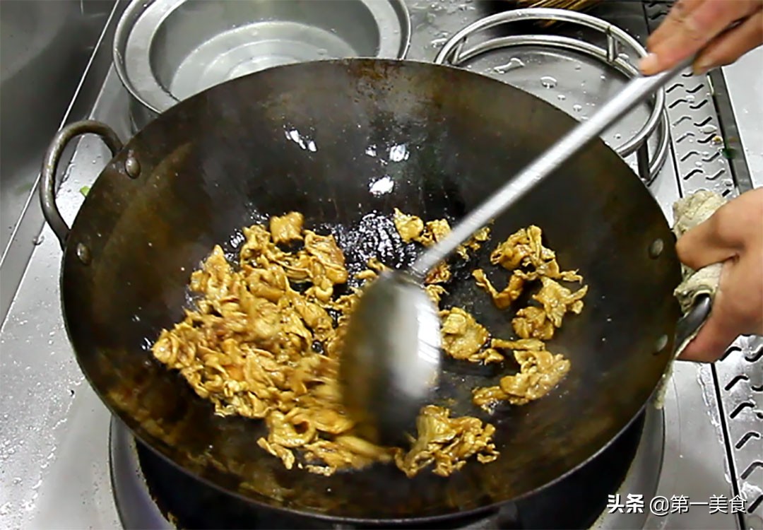 锅里烧油,把油烧至冒烟,充分滑锅后,倒入热油加入凉油,热锅冷油能防止肉片粘锅,把肉片倒入锅中快速搅散,开中火把肉片滑炒至变色,翻炒90秒左右倒出,沥干上面的油。