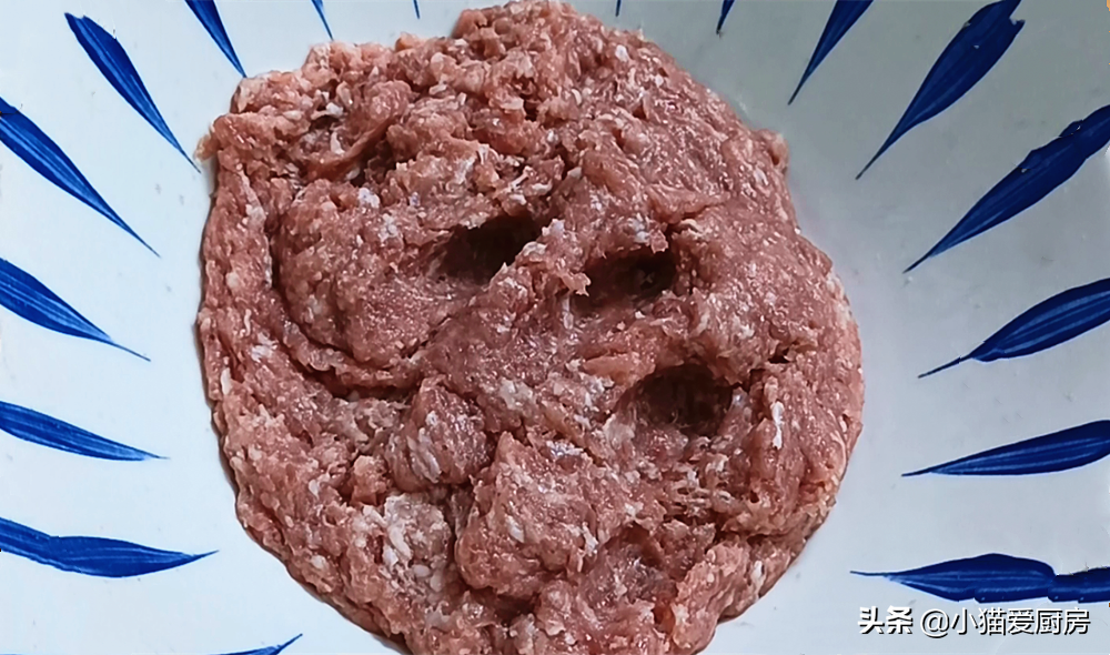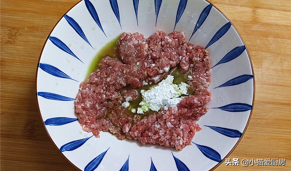 【步骤一】:把猪瘦肉简单切一下,然后剁成肉末放入碗中,依次放入葱姜水2勺、盐少许、料酒1勺、胡椒粉1勺、淀粉1勺、香油小半勺。