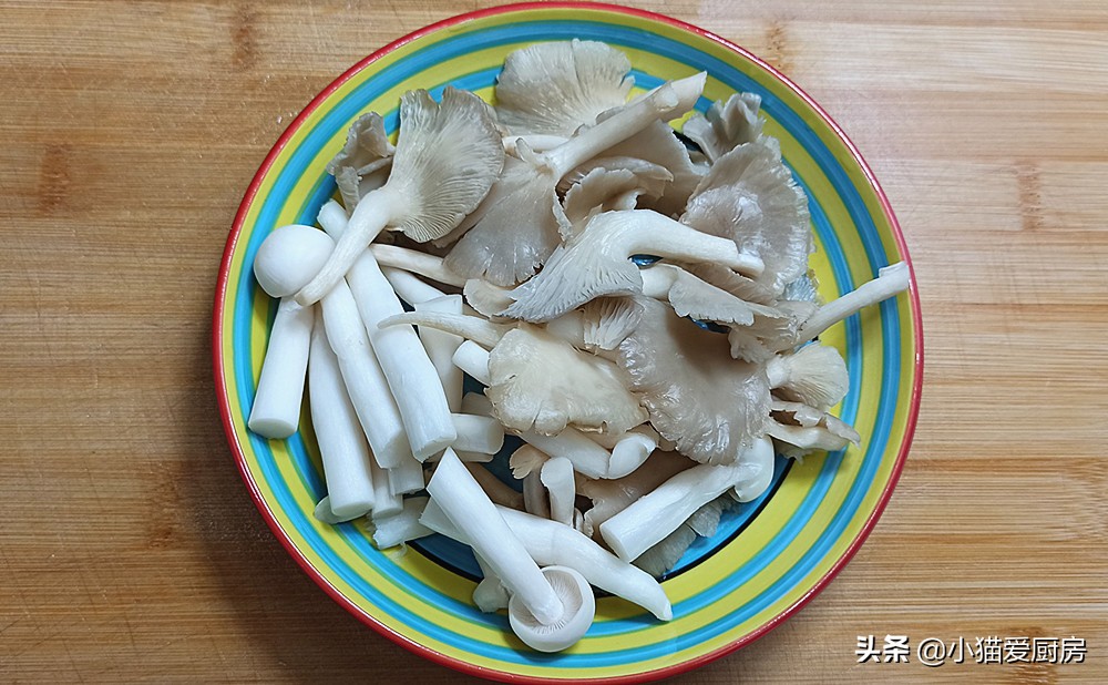 【步骤三】:蘑菇提前用盐水泡10分钟,用以去除农药残留和虫卵,然后用刀简单切成小段装盘备用。