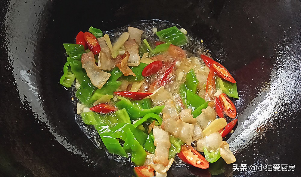 【步骤八】:葱姜炒出香味后倒入青椒和红尖椒,大火翻炒至辣椒断生。