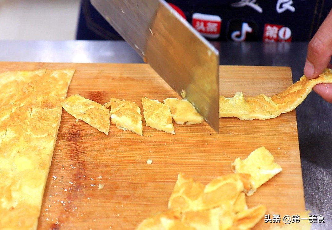 接着,我们把鸡蛋煎一下,再次烧油滑锅,滑好锅以后倒出热油加入凉油,油温五成热时倒入鸡蛋液,轻轻转动锅把鸡蛋液摊成蛋饼,定型以后沿锅边加入植物油,轻轻摇晃锅蛋饼会自动脱离,然后把蛋饼翻过来再煎一会儿,煎熟以后倒出来切成小块备用。