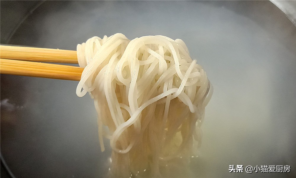 (5)煮米粉的时候要时刻观察状态,不要煮硬了,也不能煮过头,煮到米粉没有硬芯,而且劲道爽滑,提起来不断的状态最好。