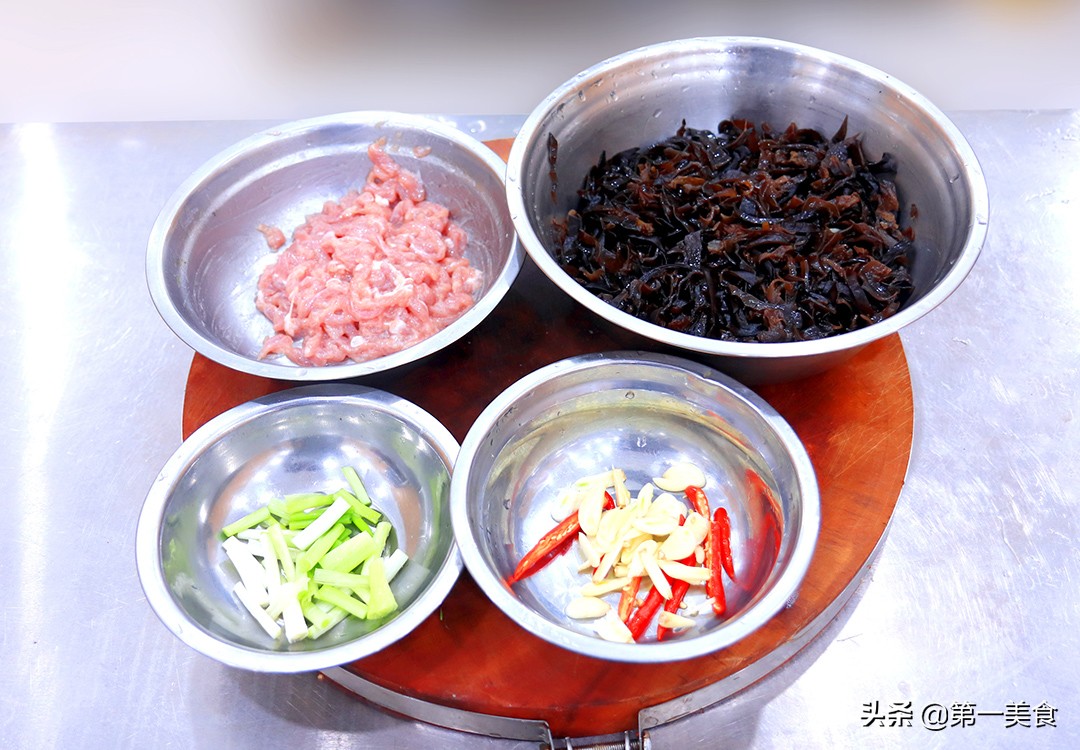 准备适量的干木耳用清水浸泡一个小时,泡软以后清洗干净,把根摘掉再切成细丝。
