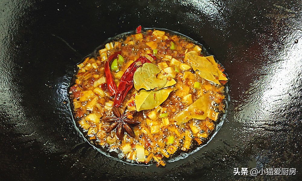 【步骤五】:炒锅中放一勺油把蒜末和生姜到里边,再放入一勺豆瓣酱和干辣椒、香叶、大料炒出香味。