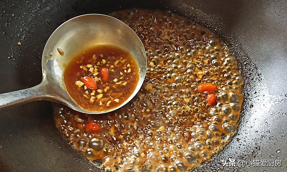 【步骤九】:取一个炒锅放少许油,把蒜末倒入锅中炒出香味,倒入准备好的调料汁,大火把汤汁收浓。