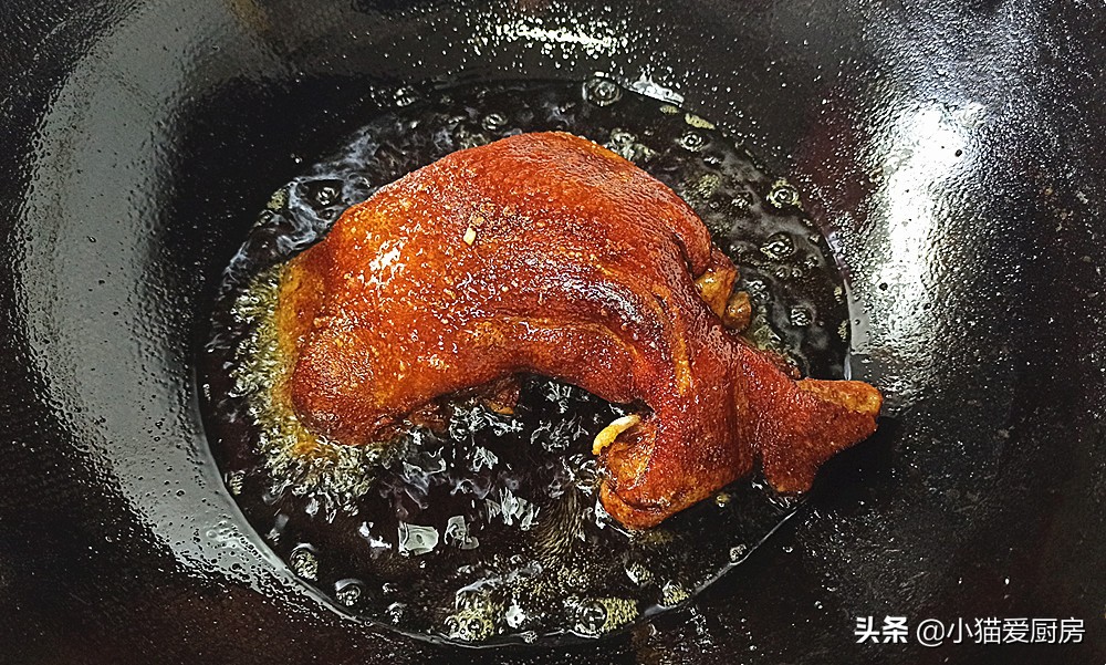 (4)炸肘子要冷油下锅,然后盖盖炸成金黄捞出,这么做主要是防止肘子炸的时候溅油,烫到自己,如果有篱笆可以把肘子放篱笆上,一起放入炸,主要是防止猪皮炸的时候粘锅。