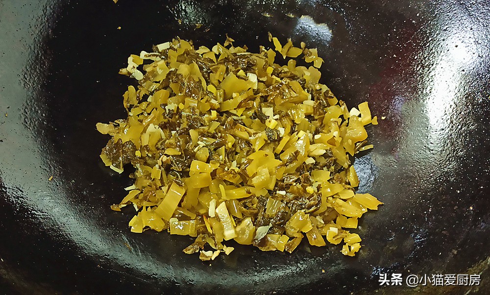 【步骤九】:炒锅少放点油,把姜蒜放里边炒出香味后倒入酸菜,大火炒干水汽。