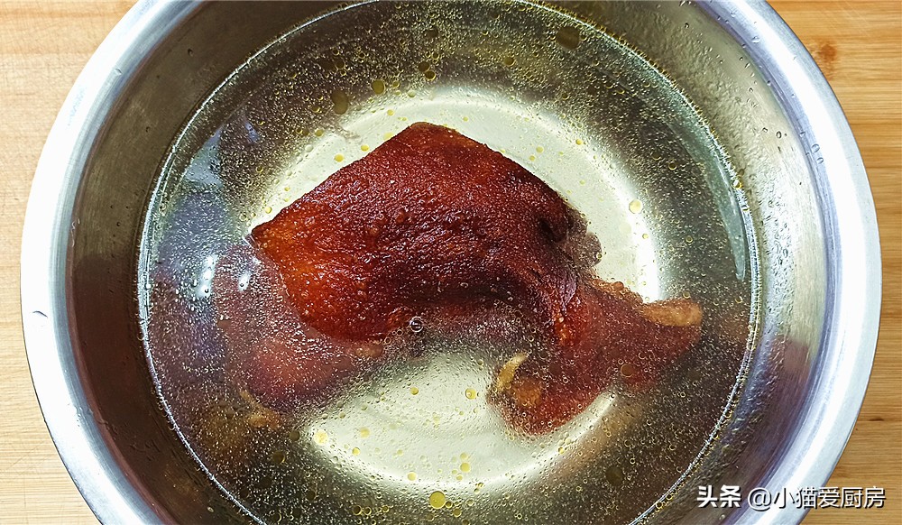 (5)炸好的肘子要用冷水浸泡出虎皮色,这样肘子非常好看。