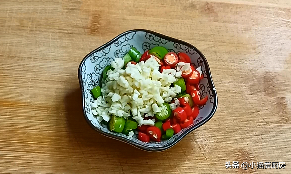 【步骤九】:锅中留底油,把蒜末、青红尖椒倒入锅中,小火炒香、尖椒炒至虎皮色。