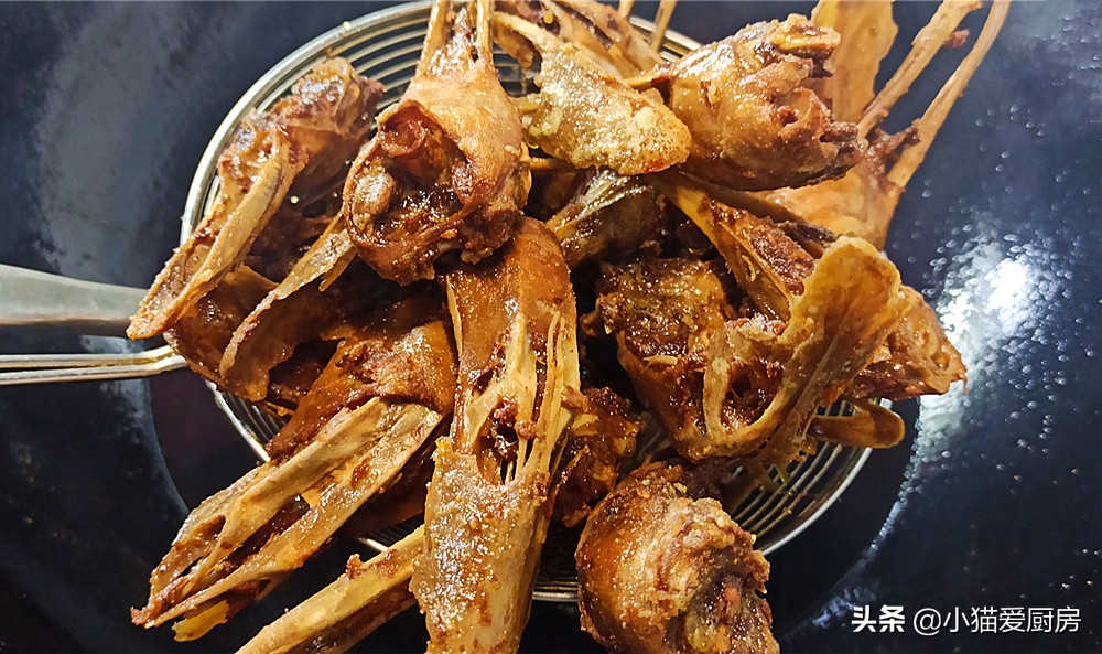 (5)炸鸭头要先低温浸炸,小火把鸭头炸透,然后用大火炸至表皮酥脆,这样炸完的鸭头才香。