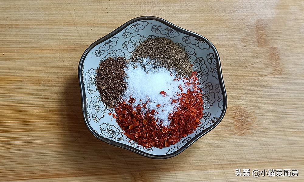 【椒盐调料】:盐小半勺、孜然粉1勺、辣椒面1勺、花椒面1勺