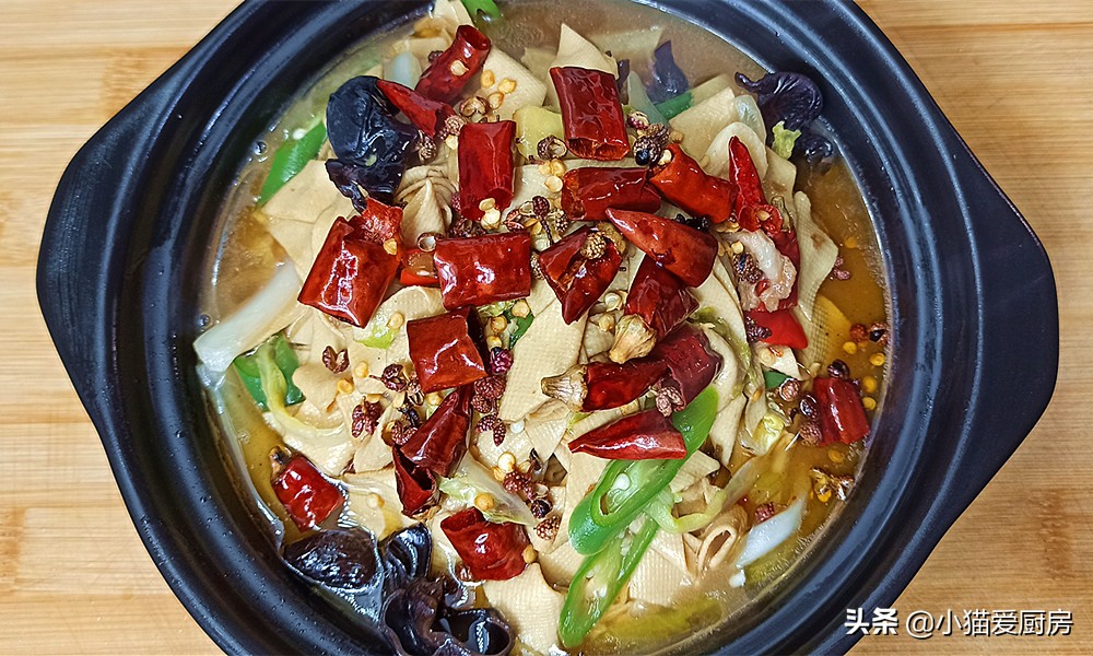 【步骤十】:把干辣椒和花椒放入勺子中,浇入冒烟 的热油,把干辣椒和花椒的香味激发出来倒入干豆腐和白菜中成菜。