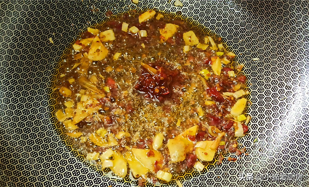 【步骤六】:锅中放一勺油烧热,把葱姜蒜、豆瓣酱倒里边,用中火炒出香味。