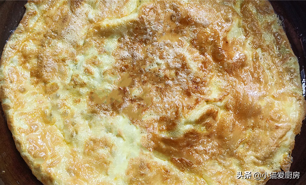 【步骤七】:取一个平底锅,锅底刷一层油烧热,把鸡蛋液倒入锅中,稍微转动,让鸡蛋液平铺在锅底,然后小火把蛋液煎成金黄色的鸡蛋饼。