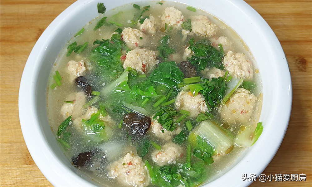 【步骤六】:全部肉馅都做成丸子下锅中,等丸子烫定型后,开稍微大一点的火,把丸子煮漂起来,放入泡发的木耳和小白菜,同时放入盐1勺、胡椒粉1勺,大火烧开煮1分钟。