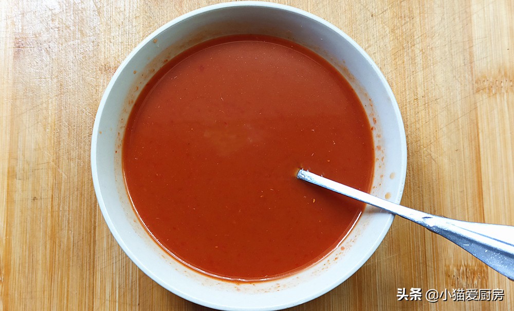 【步骤二】:取一个小碗,依次放入番茄酱2勺、韩式辣酱2勺、香醋两勺、白糖半勺、半碗清水,然后搅拌均匀兑成调料汁备用。