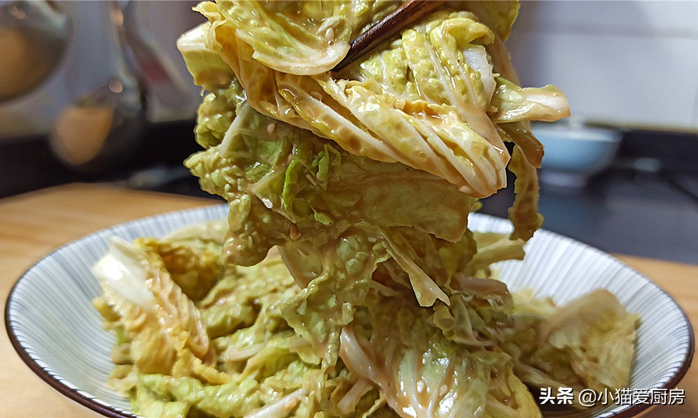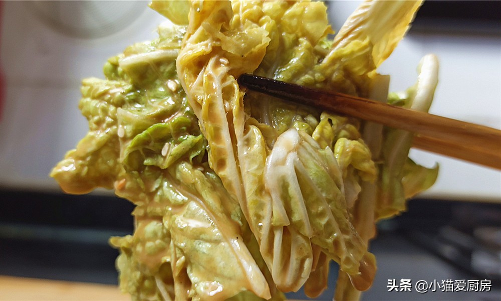 (3)浸泡完的大白菜要把水分充分晾干,否则会因为有水的残留无法挂上料汁,也会影响这道菜的味道。