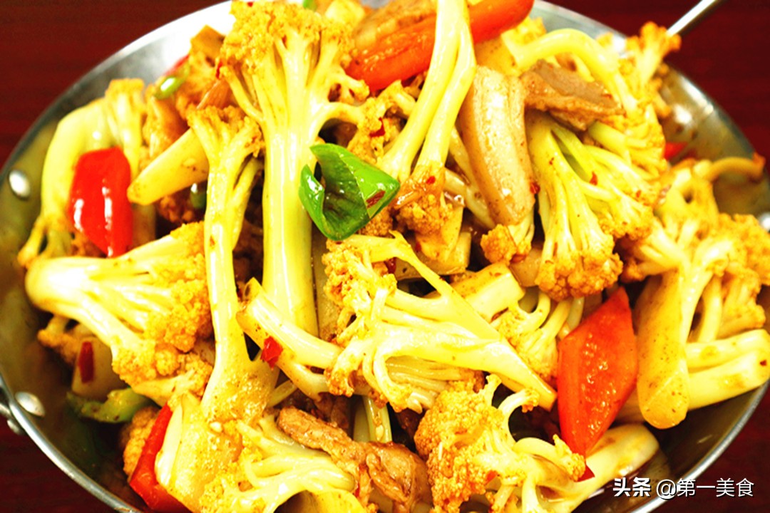 2.做干锅花菜千万不能焯水,为啥呢?花菜一煮就面了,咋炒都不会脆。饭店常用的方法是滑油,油温要高一点,六成热时倒入花菜,快速滑油至微微返青立即捞出,也就五六秒的时间,时间一长脆感就消失了,你要是觉得这样油太大,那就大火快速煸熟,不过油要比平时炒菜多放、口感也香脆。