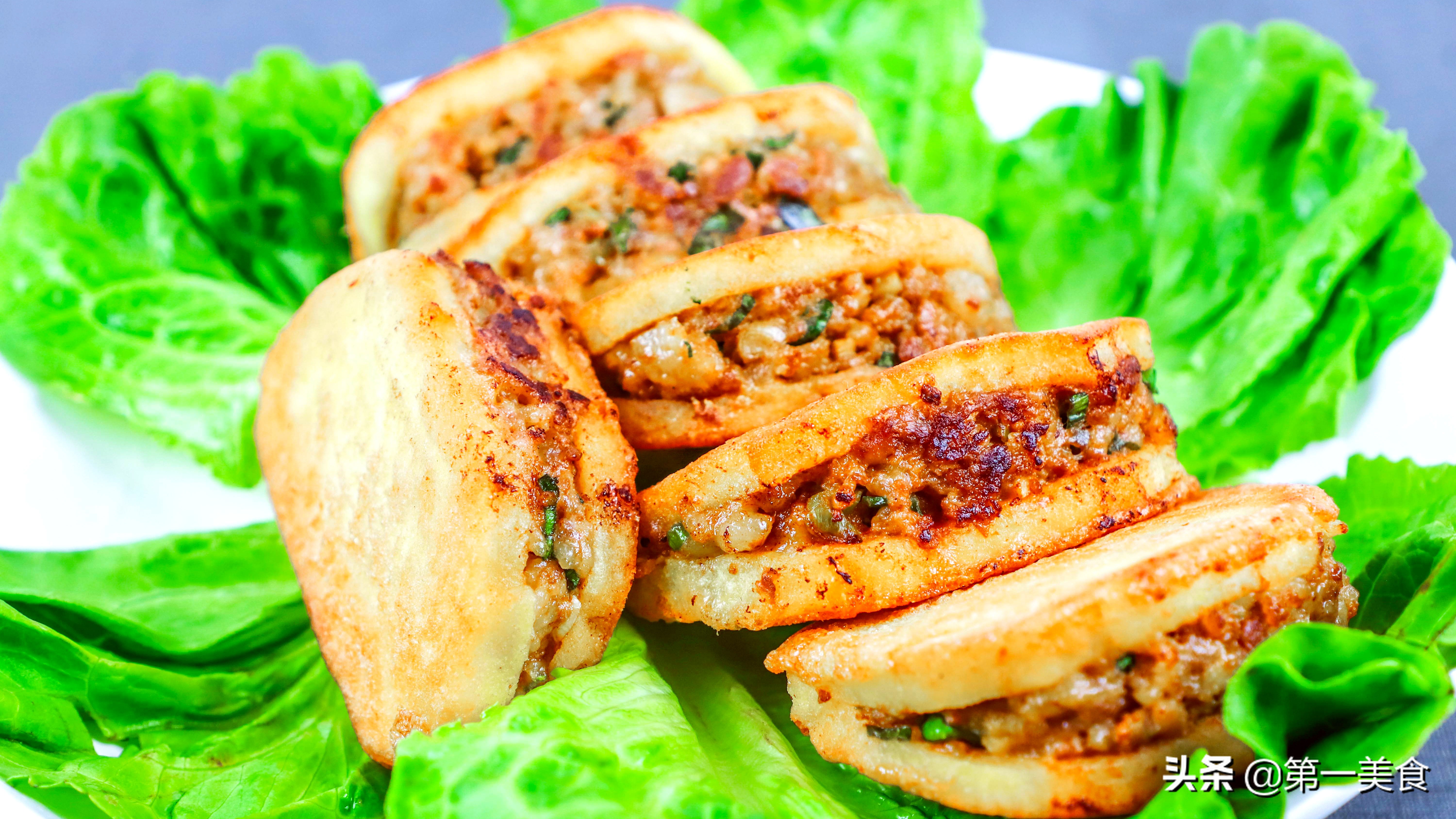 3、油煎肉夹馍,油温升至五成热时,转小火依次放入馍片。大约煎一分钟,等底部稍硬蛋液鼓泡时翻面。煎至另一面边缘微焦时,再次翻面。保持小火,煎3分钟左右,馍片煎至两面金黄酥脆时把馍片立在锅中,让肉馅充分受热,把肉馅表面煎成焦红即可出锅装盘。