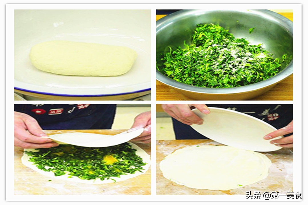 3.面团饧好以后稍微揉几下、搓成条、揪成面剂子、擀成中间厚两边薄的面片子,然后铺上一层荠菜,磕上一个鸡蛋,用另外一个面片盖住,用碗或者盘轧一圈,把边压实就行了。