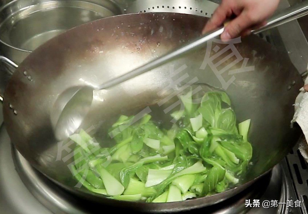 锅中烧水,加入植物油,食盐入底味,倒入上海青,焯水10秒钟倒出来,用凉水快速地冲洗降温,使青菜更加清脆。