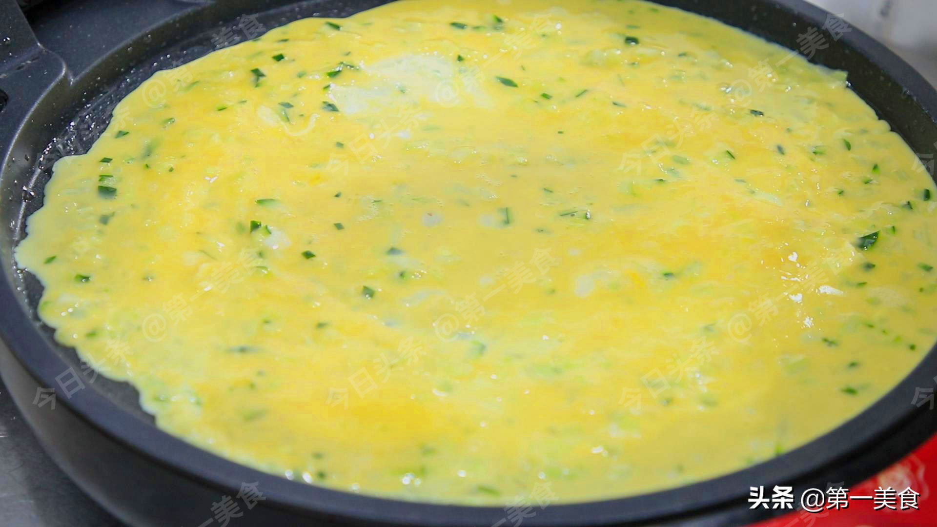 这个鸡蛋饼非常薄,一边熟了以后再翻过来简单一烙整张鸡蛋饼就全熟了。