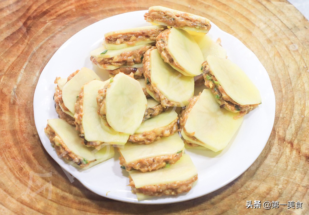 在土豆片中塞入适量的肉馅,把边缘涂抹平整,让土豆夹紧紧地裹住肉馅即可,把所有的土豆夹都这样做好。
