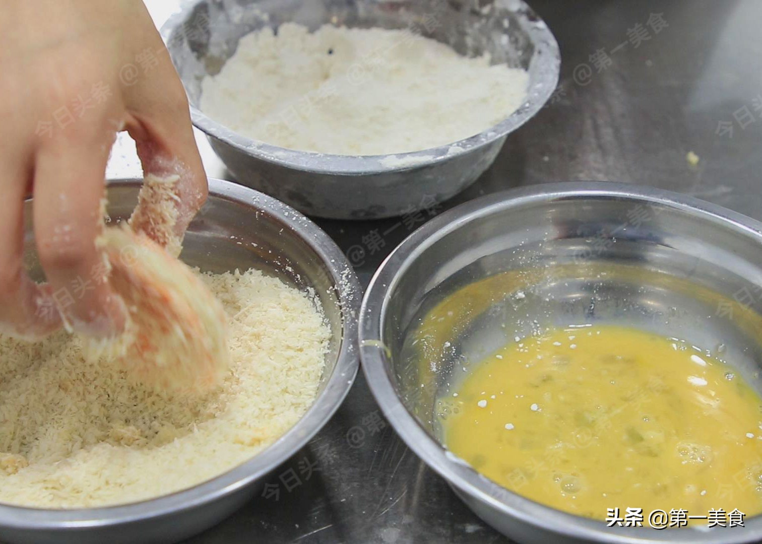 盆里打入三个鸡蛋,把鸡蛋搅散,再准备一个小盆,倒入面包糠。