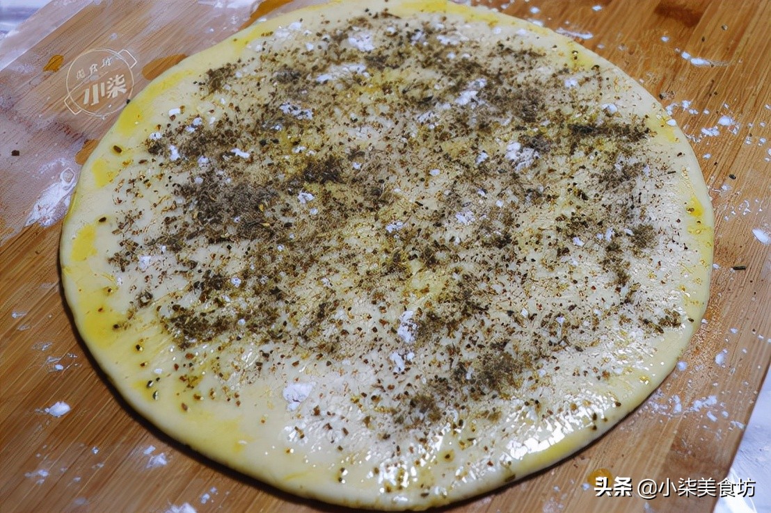取出其中的一个剂子擀成圆饼,厚度大约5毫米左右,表面抹少量食油,放油主要起到分层的效果。