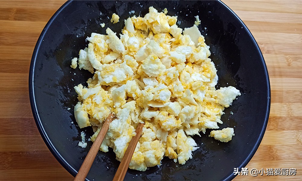 【步骤五】:把鸡蛋打入馒头中,然后用筷子搅拌均匀,让鸡蛋和馒头充分融合。