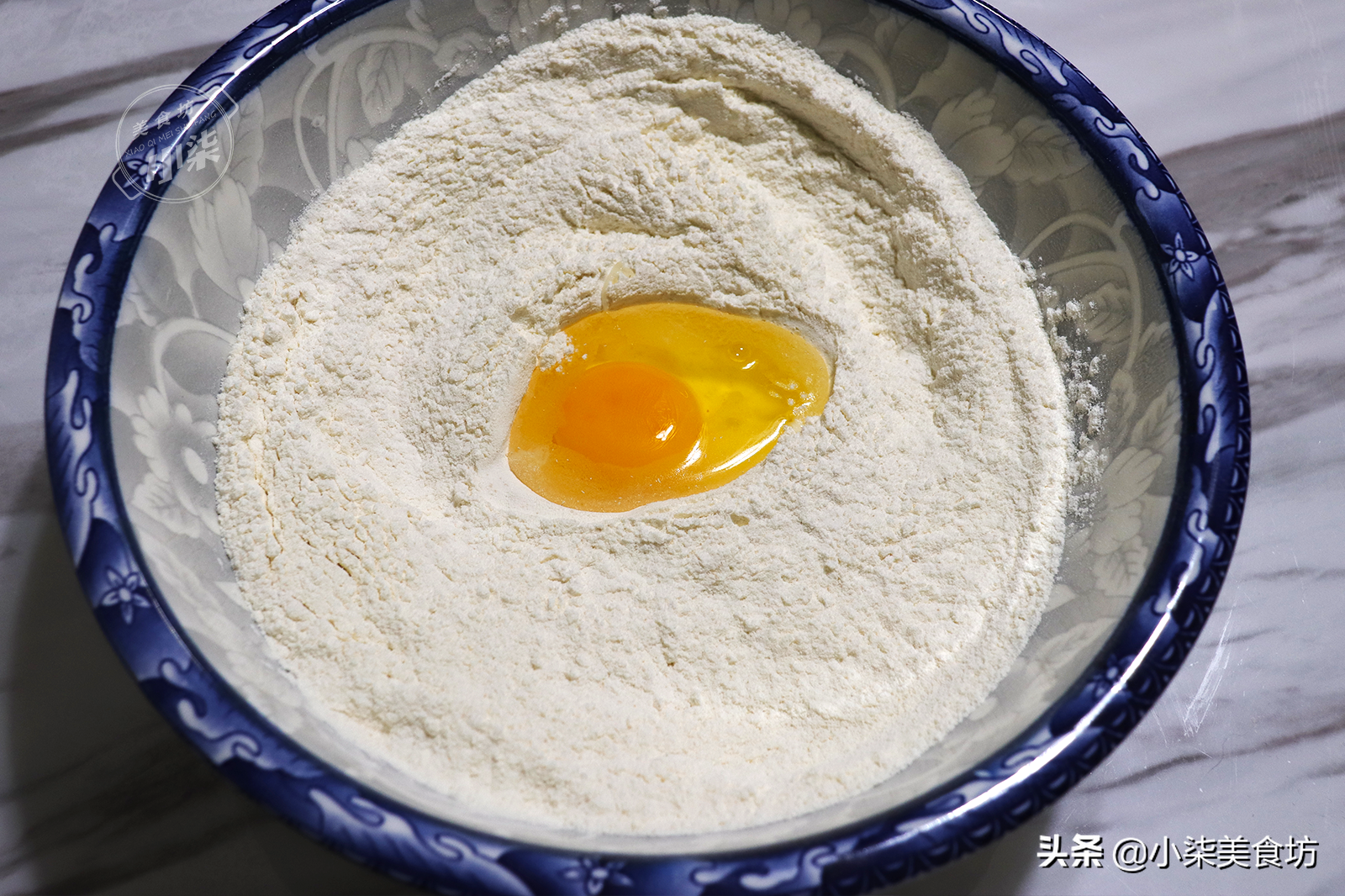 再准备一个鸡蛋打入面粉里,鸡蛋的重量大约50克左右,然后和面粉搅拌在一起。