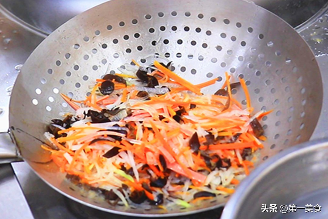 2.锅内加入适量的清水,大火烧开以后先放入冬瓜和胡萝卜煮至断生,大约需要30秒钟,再放入木耳稍微烫一下倒出来,快速放入清水中过凉,这样吃起来更加清脆。