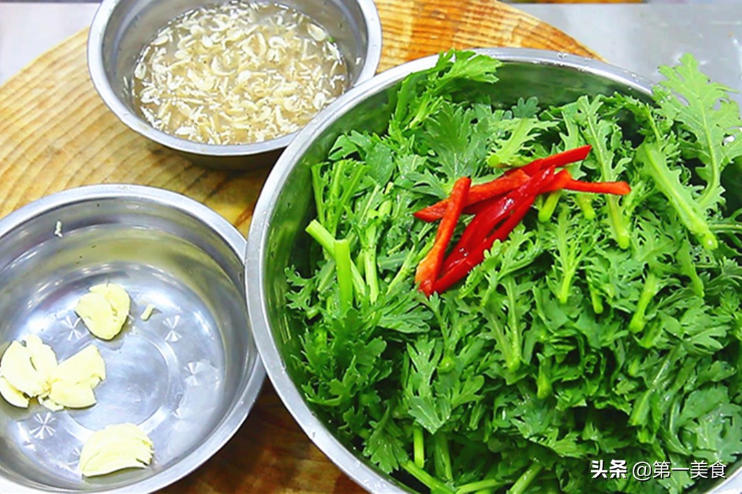 1.首先,我们准备虾米一小把,放入清水中浸泡一会,去除虾米中多余的盐分;一把茼蒿洗干净以后,切成3厘米左右的段;再切一点红椒丝用来配色;大蒜几粒拍扁,放在盆里备用。
