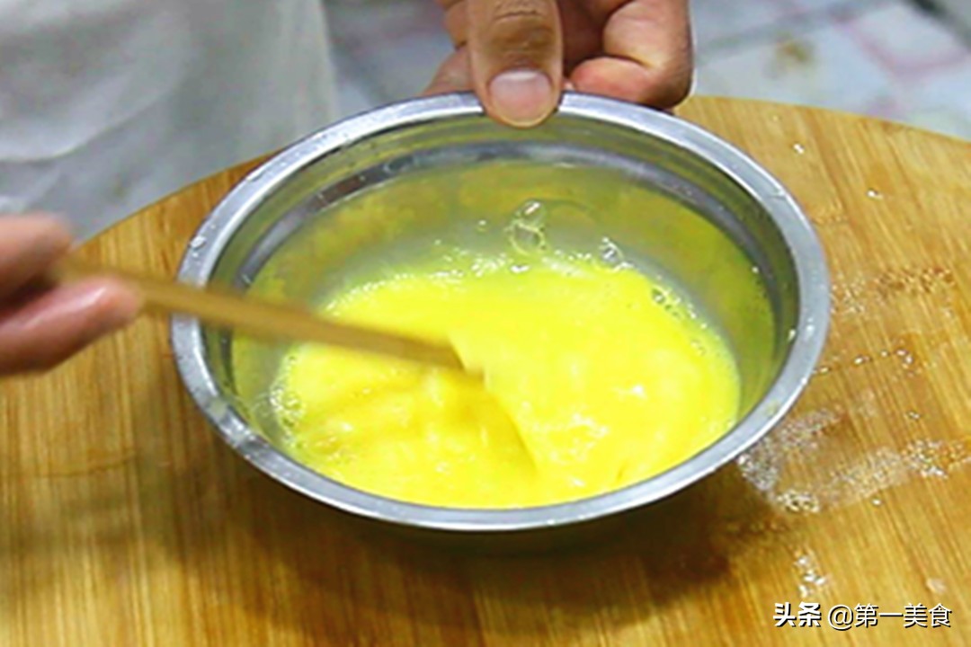 3.锅里烧油,充分滑锅以后把热油倒出来、重新加少许凉油,起锅把鸡蛋倒入锅内,转动锅摊成蛋饼,保持小火、一面煎好以后翻过来煎另一面,全部定型就可以出锅了。