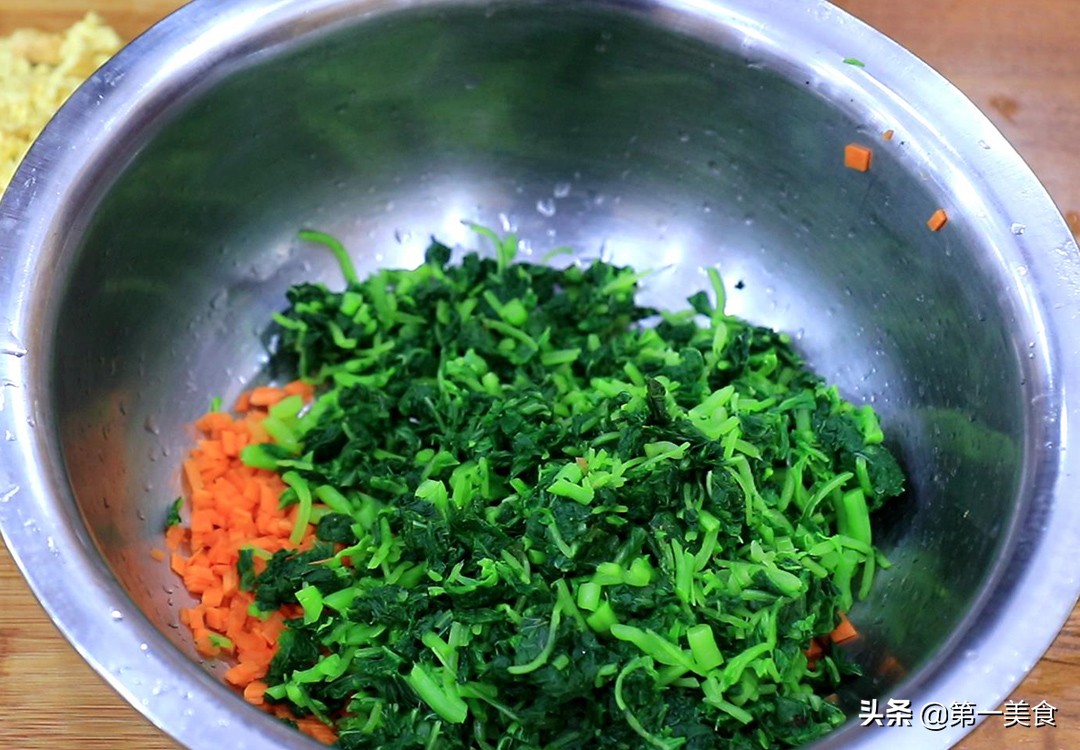 锅内烧水,加入少许食盐和植物油,让菠菜色泽更加鲜亮,防止营养流失,水烧开以后放入菠菜,焯水能够减少菠菜中的草酸,菠菜断生后倒出来,用清水冲洗,控干水分。