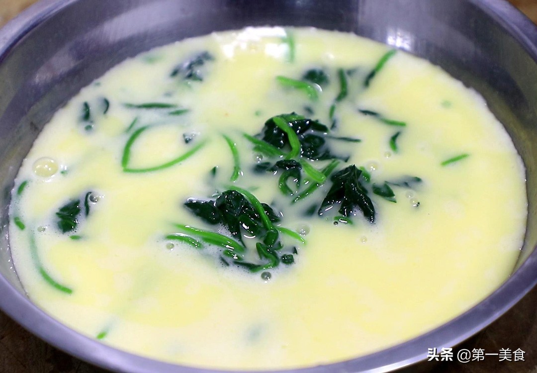 把蛋液倒入菠菜中,倒的时候把蛋液过一下滤网,筛出气泡和没有打碎的蛋清,使蒸出的蛋羹更加平整嫩滑。