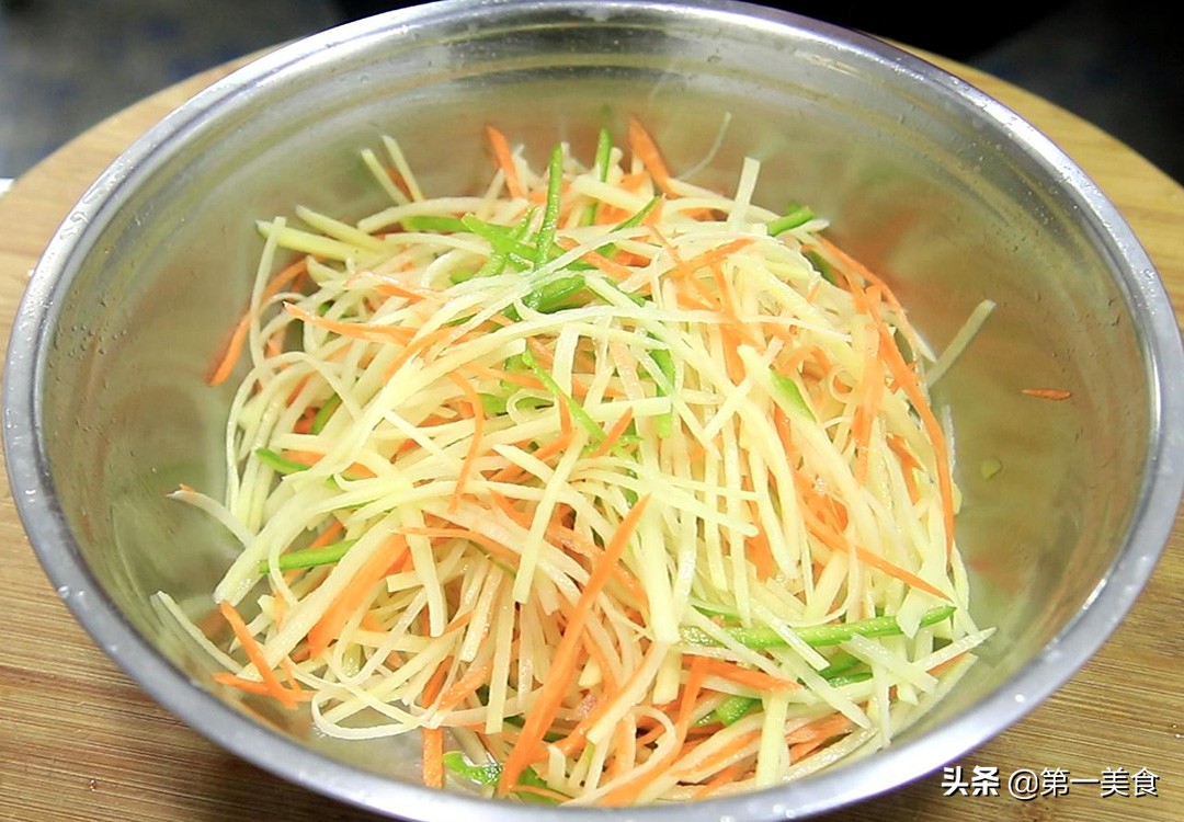 准备胡萝卜半根,同样切成细丝,切点青椒丝放在一起,主要用来配色。