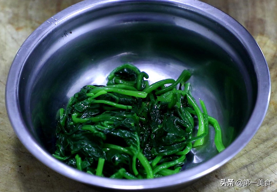锅中烧水,放入少许食盐和植物油,食盐入底味,植物油保持菠菜的翠绿,水烧开以后把菠菜放入锅中,焯水20秒钟,菠菜变软后倒出来,用清水冲凉,控干以后切成段备用。