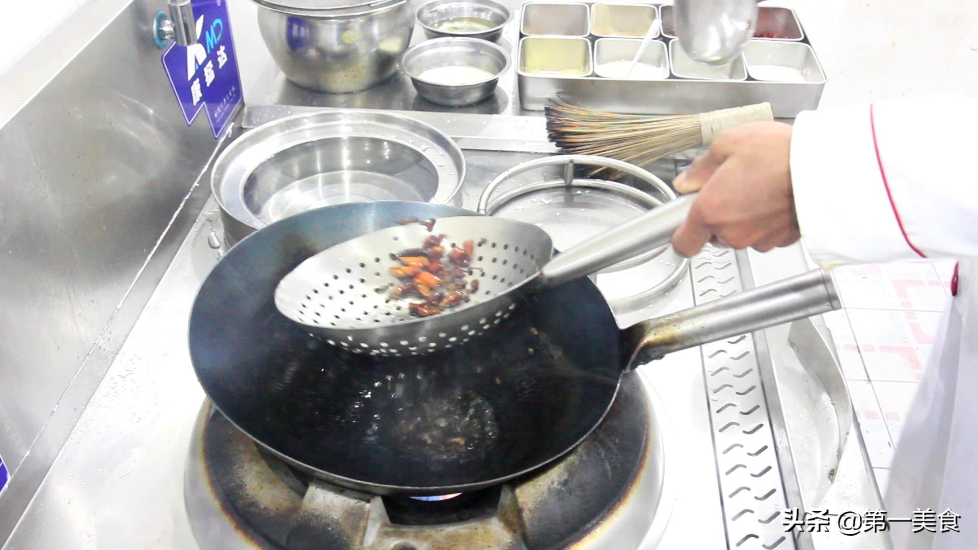 3.锅里倒入一勺植物油,加入一把花椒,一把红干椒,炒出香味后, 捞出残渣。