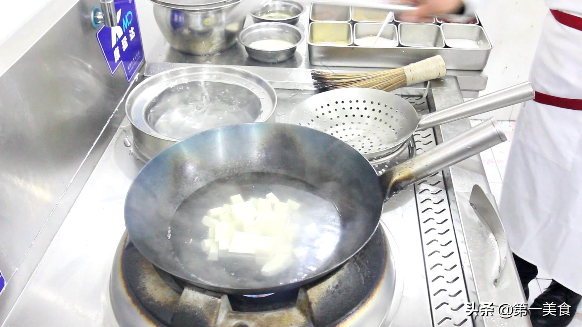 2.锅内倒入清水,加入两勺食盐,水开后倒入豆腐,焯水一分钟,捞出沥干水分。