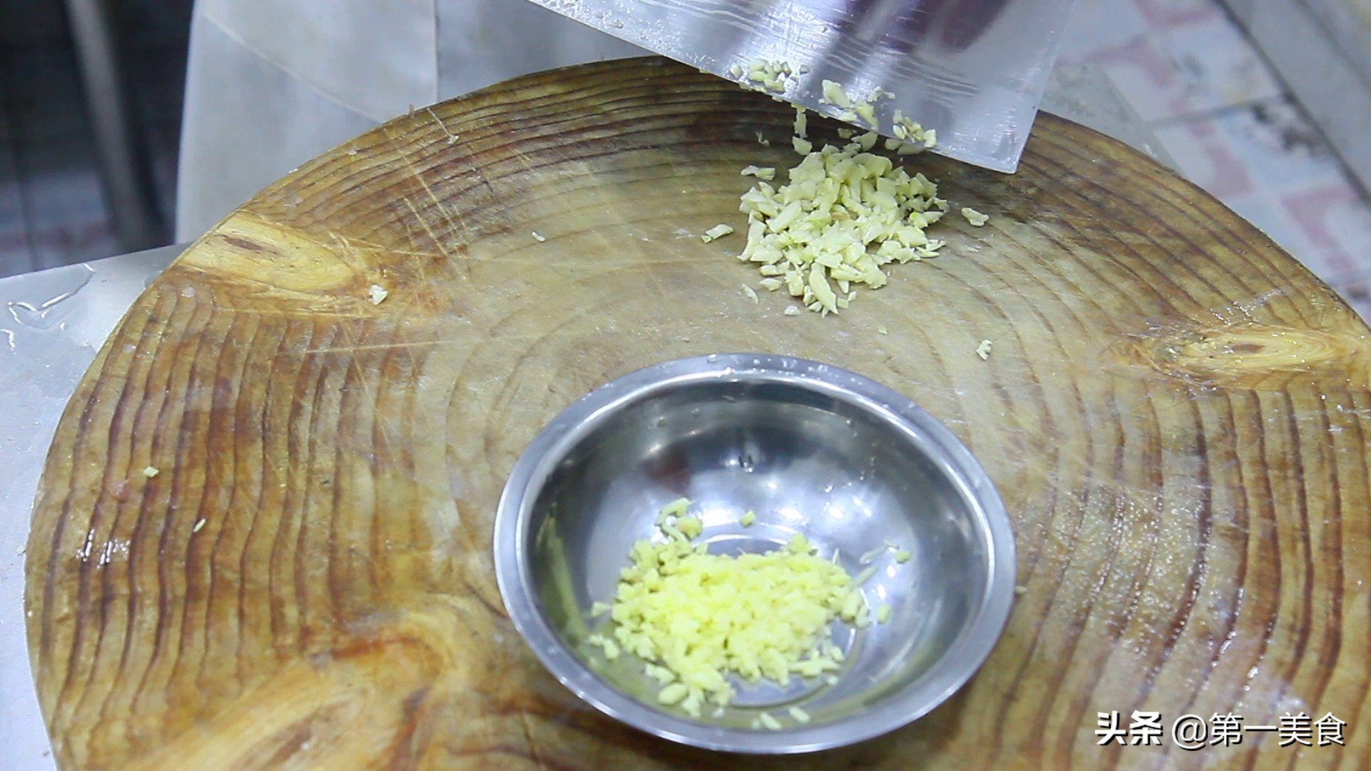 3.生姜一小块,切成碎沫,放入小盆中,大蒜几粒,拍扁后切成碎沫,和生姜放到一起备用。