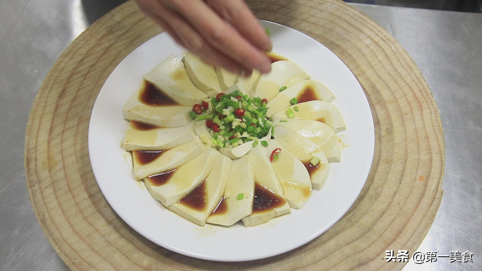 1.嫩豆腐一块,切成豆腐片(不要太薄),切豆腐时容易粘刀,最好倒着切。(切好后按照下图摆盘)小葱一把,切成小葱花,小米椒几粒,切成辣椒圈。准备大蒜几粒,拍扁后,切成蒜末。