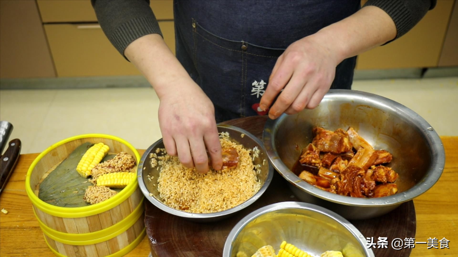 糯米一定要提前四个小时泡上,蒸出来才软糯。精肋条多准备几根,砍成段,用清水泡半个小时,去除里面的血水。玉米切成条。
