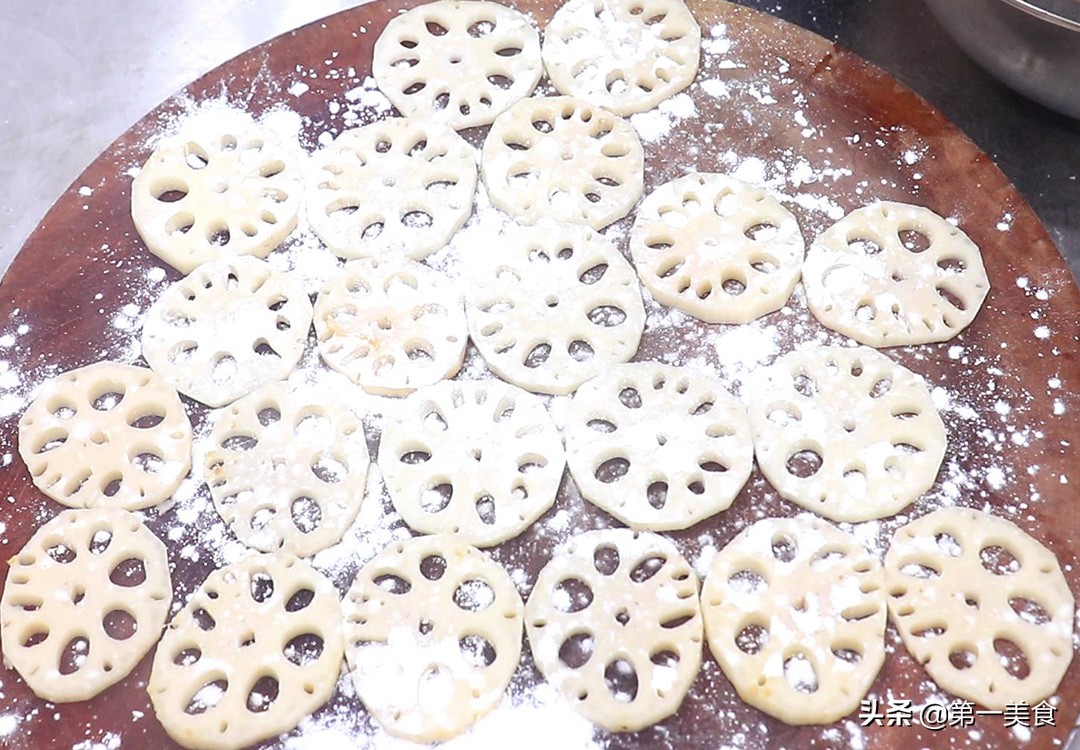 准备两节莲藕,削去外皮,切成和硬币差不多的藕片,均匀地撒上面粉,增加藕片的粘合力。