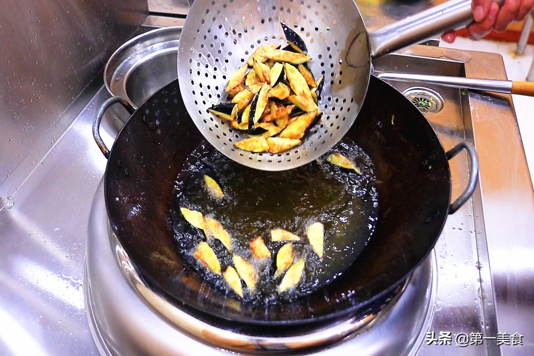 然后把油温升至7成热,转为小火,放入茄子继续炸10秒钟。茄子炸酥,炸成金黄色时捞出来控油。