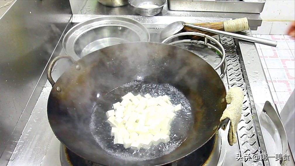 嫩豆腐,切成豆腐块。锅内烧水,加入一勺食盐,水烧开后把豆腐倒入锅内,用勺子轻轻推动,不要直接把勺子碰到豆腐,嫩豆腐容易碎,豆腐焯水时加入食盐,既可以去除豆腥味,也可使豆腐不易破碎,增加豆腐的底味,口感更好。