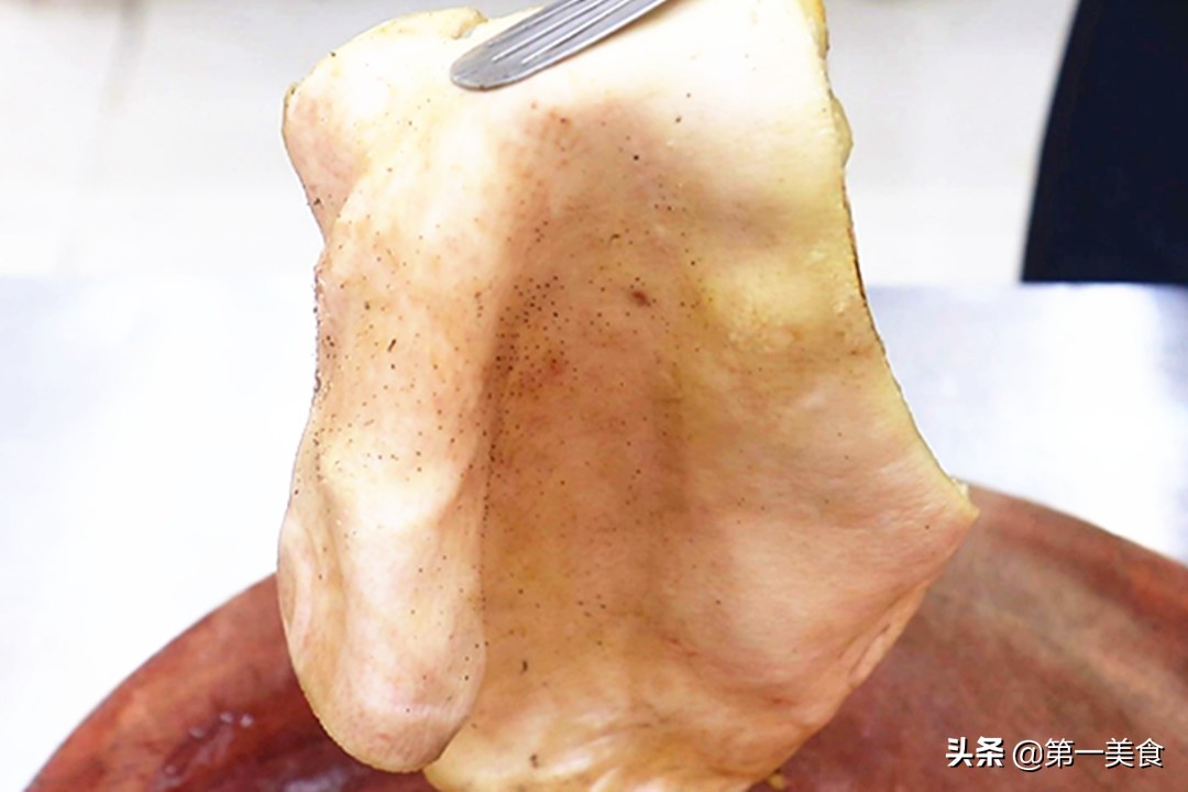 锅内烧水,把洗干净的猪皮冷水放入锅中焯一下水,水烧开以后再煮两分钟,把猪皮倒出来用温水清洗干净,这里最好不要用凉水,以免猪皮遇冷收缩变硬、难以去除油脂。然后把猪皮划成长条、片去上面的油脂,这样做出来的猪皮冻不会腻口。油脂片干净以后把猪皮放入盆中,多撒一些食盐,再反复搓洗几分钟,彻底把油脂和异味去除干净,然后冲洗干净、切成丝备用。