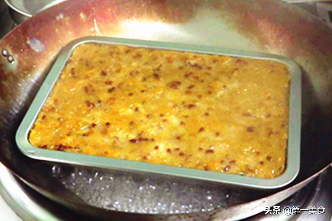 准备一个托盘,均匀刷上植物油,把拌好的肉末粉条倒在托盘里面,反复震一震排出里面的空气。烧半锅开水,把肉末粉条放进去,开中火蒸30分钟就可以了。30分钟以后焖子已经蒸熟 定型了,我们把它取出来,放在一边晾一会降降温倒扣出来就可以了。
