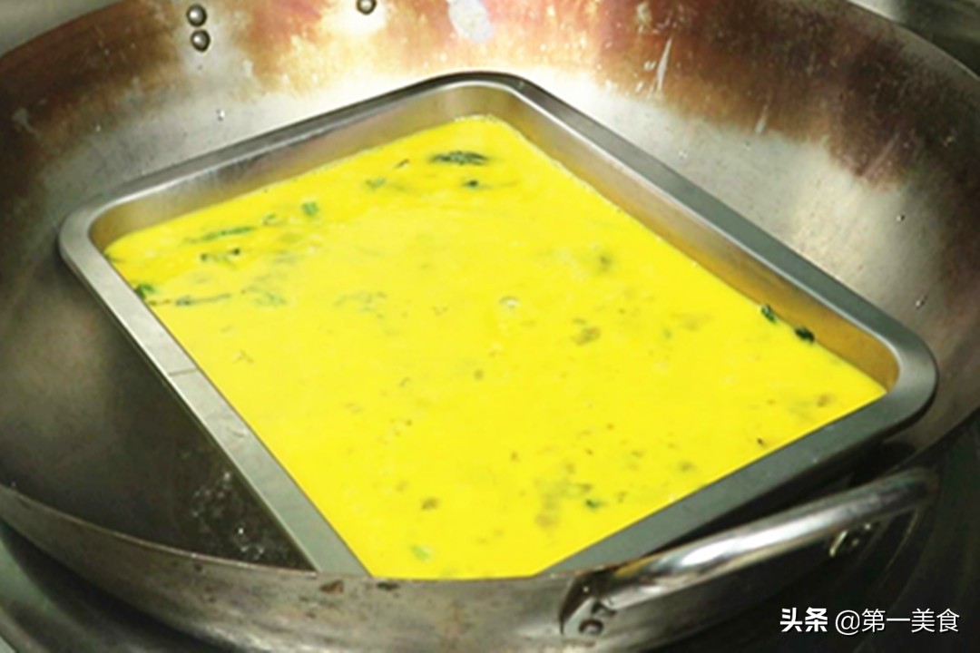 4.烧半锅开水,把鸡蛋菠菜放进去先大火蒸3分钟,蛋清定型以后取出来,把蛋黄淋在上面铺平,继续蒸2分钟就可以了。